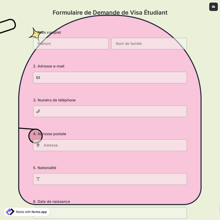 Si vous êtes un établissement qui délivre des visas aux étudiants, vous pouvez demander aux candidats de remplir un formulaire de candidature et de collecter toutes les données nécessaires en un seul endroit. forms.app vous permet de créer une demande de visa étudiant gratuite. En dehors de cela, vous pouvez ajouter ou supprimer tous les champs de formulaire de votre choix à partir de la page d'édition. Alors commencez dès maintenant avec notre modèle gratuit de formulaire de demande de visa étudiant ici.