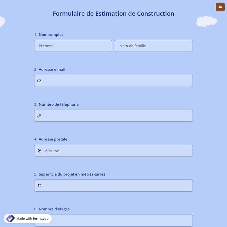 Le formulaire d'estimation de construction est une étape cruciale dans le processus de construction. Il aide les clients à estimer tous les coûts impliqués, des matériaux à la main-d'œuvre et tout ce qui se trouve entre les deux. forms.app offre un modèle de formulaire d'estimation de construction gratuit.