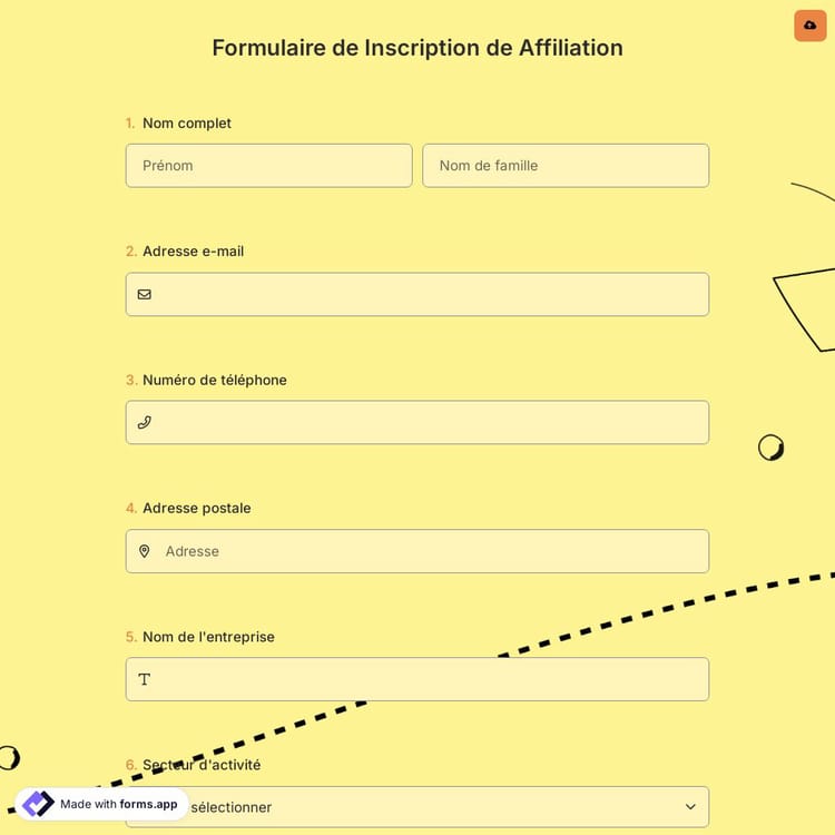 Un formulaire d'inscription d'affiliation est un formulaire que les entreprises utilisent pour collecter des informations auprès des individus ou des entreprises intéressés à devenir des affiliés de leur entreprise. Le marketing d'affiliation est un type de marketing basé sur la performance dans lequel une entreprise récompense les affiliés pour chaque client apporté à l'entreprise par les efforts de marketing de l'affilié. En collaborant avec des affiliés, une entreprise peut étendre sa portée et potentiellement augmenter sa base de clients.