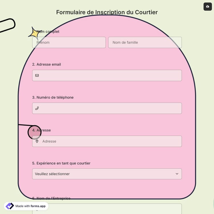 Un formulaire d'inscription pour courtier soigneusement conçu pourrait aider votre personnel des ressources humaines à trouver le candidat idéal pour le poste de courtier. Désormais, vous pouvez réaliser tout cela et bien plus encore avec les modèles de formulaire d'inscription intuitifs de forms.app de manière efficace !