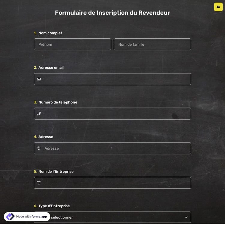 Un formulaire d'inscription de revendeur demande généralement les détails suivants