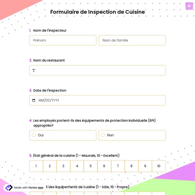 Vous prévoyez de créer une enquête détaillée sur l'état des cuisines à inspecter ? Utilisez dès aujourd'hui le modèle de formulaire d'inspection de cuisine de forms.app et créez des formulaires d'inspection de cuisine de qualité supérieure, conviviaux et attrayants de votre choix sans aucune compétence en codage requise !