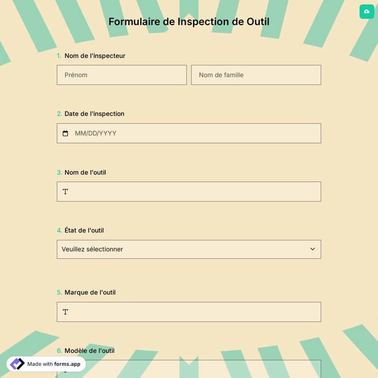 Les formulaires d'inspection sont un excellent moyen de recueillir des commentaires et de combler les lacunes. forms.app vous offre un modèle de formulaire d'inspection d'outil prêt à l'emploi sans codage. Essayez-le et profitez de différentes fonctionnalités et options de partage. Pour le consulter et l'utiliser, cliquez sur le bouton "Utiliser le modèle".