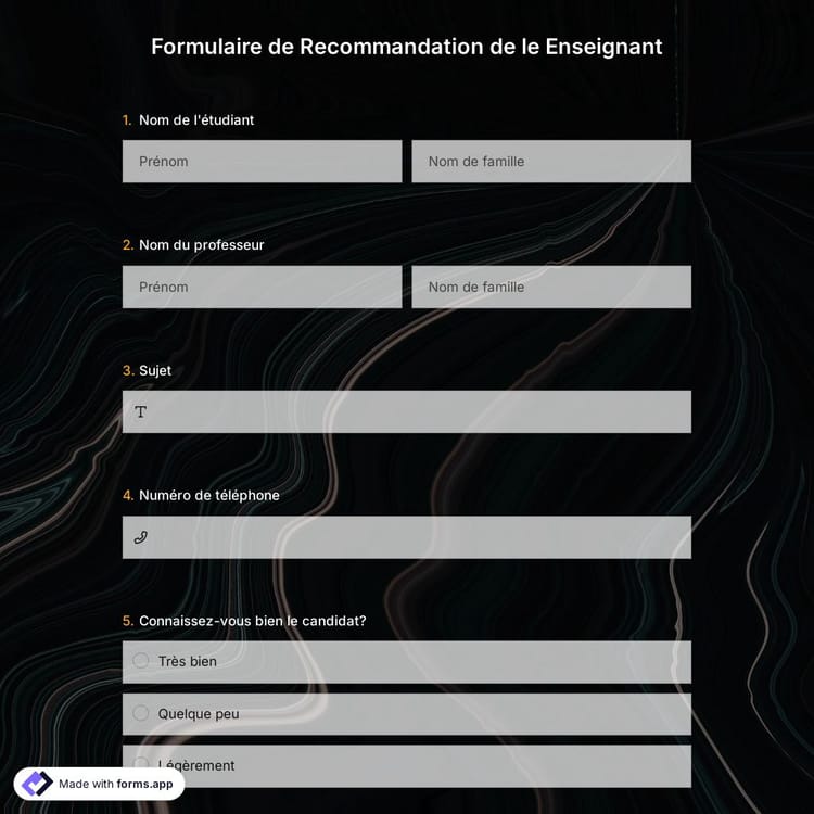 Le modèle de formulaire de recommandation de l'enseignant forms.app, un type de formulaire de demande, comporte quelques questions standard, telles que: