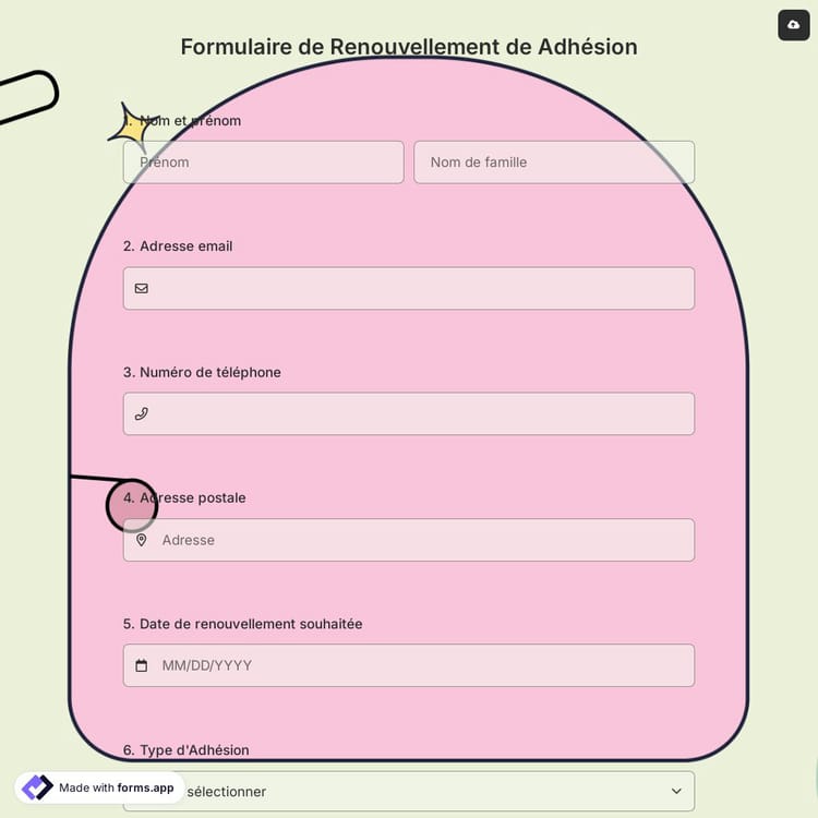Les formulaires de renouvellement d'adhésion sont des documents utilisés pour collecter des informations auprès des membres qui souhaitent renouveler leur adhésion dans un club ou une organisation. Ce formulaire peut être utilisé par des organisations de toutes tailles, des petits groupes aux grandes organisations nationales ou internationales. Créez votre formulaire en utilisant les modèles de formulaire gratuits de forms.app et facilitez votre processus de renouvellement d'adhésion.