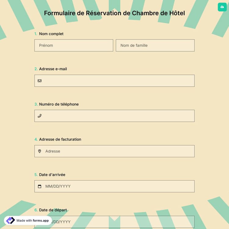 Un formulaire de réservation est essentiellement un document qui comprend des questions et des champs de formulaire pour recueillir les détails de la réservation. Il peut s'agir d'un hôtel, d'un restaurant ou de bien d'autres occasions de ce type. Avec un formulaire de capture des réservations, vous pouvez capturer des informations sur les titulaires de réservation, telles que: