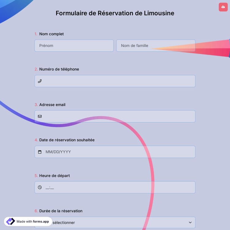 En utilisant les fonctionnalités de forms.app, vous pouvez utiliser ce modèle de formulaire de réservation de limousine gratuitement et commencer à voir une augmentation du nombre de réservations après avoir intégré le formulaire sur votre site.