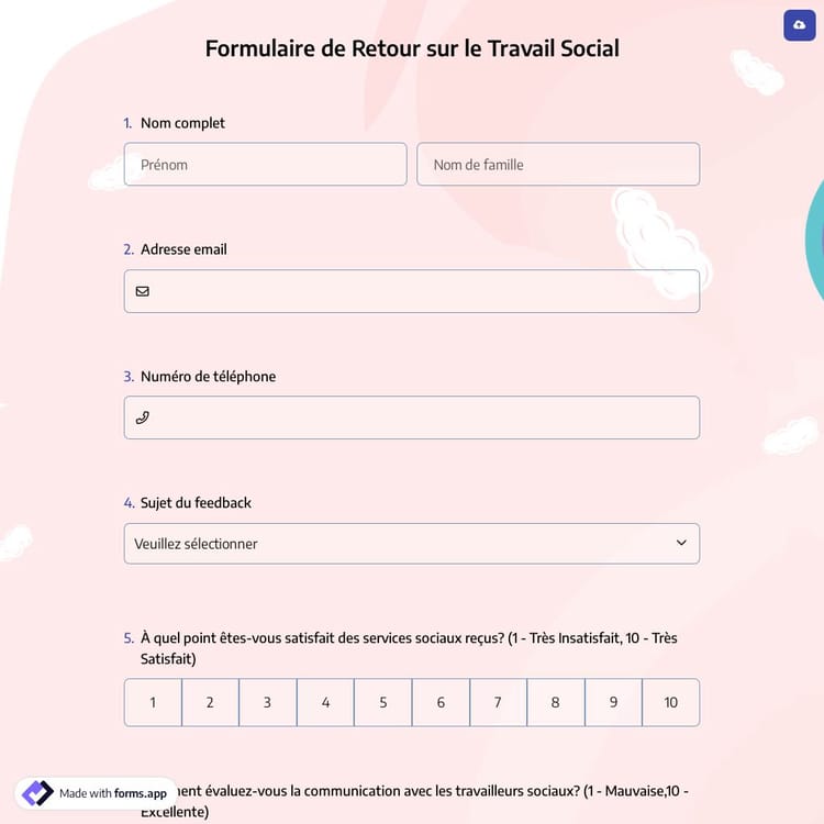 Le formulaire de rétroaction sur le travail social est un document en ligne qui vous aide à recevoir des commentaires sur le travail social. Il pose des questions sur la satisfaction des individus envers le travail social, la satisfaction envers le travailleur social et une évaluation globale du travail social. Créez votre formulaire de rétroaction sur le travail social sur forms.app sans avoir à écrire de code.