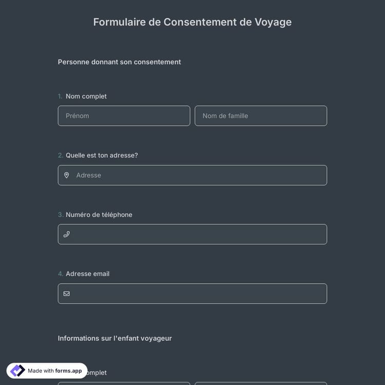 Un formulaire de consentement de voyage est utilisé pour recueillir le consentement des parents pour les enfants voyageant seuls ou en groupe. Cela rend également le processus plus facile et sans effort pour vous et les parents. Utilisez le modèle de formulaire de consentement de voyage gratuit de forms.app pour collecter les documents de consentement maintenant !
