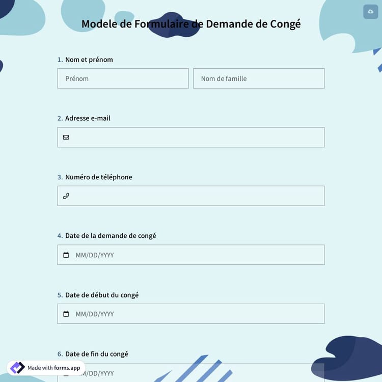 Un formulaire de demande de congé aide les employés à informer les ressources humaines ou les gestionnaires de leurs demandes de congé. Lorsqu'un employé a une demande de congé, vous saurez pourquoi et quand il s'absente du travail. Pour créer votre formulaire en ligne, utilisez dès aujourd'hui le modèle de formulaire de demande de congé gratuit de forms.app !