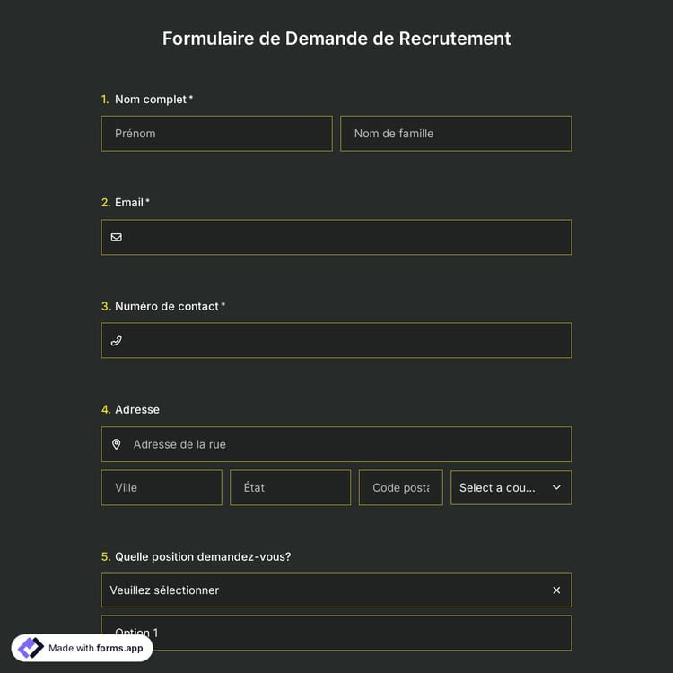 Que vous créiez un formulaire de demande d'emploi ou un formulaire d'adhésion, forms.app vous propose gratuitement des modèles de qualité supérieure. Ces modèles de formulaires de candidature sont accompagnés de questions courantes ou de champs de formulaire que vous aimeriez probablement inclure dans votre formulaire. Naturellement, cela vous fera gagner du temps et vous aidera à créer de meilleurs formulaires et enquêtes plus rapidement. Alors, choisissez l’un de nos exemples de formulaires gratuits pour créer des formulaires en ligne professionnels dès aujourd’hui.
