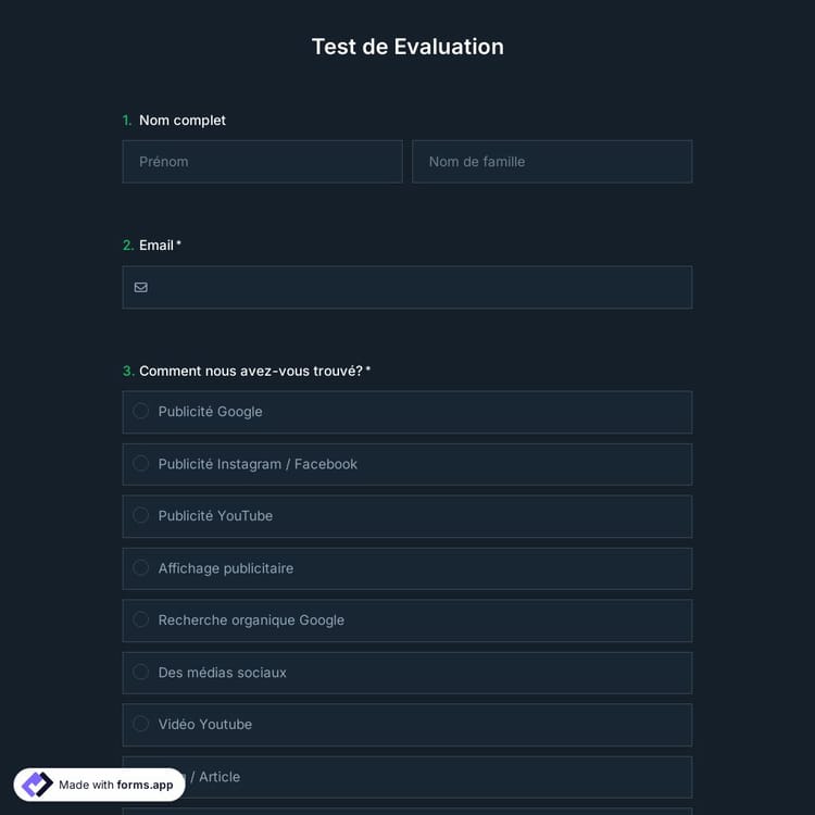 forms.app vous fournit un excellent formulaire d'évaluation à des fins générales. Bien qu'il soit possible de l'utiliser sans qu'il soit nécessaire d'apporter des modifications autres que les questions, vous pouvez modifier votre formulaire d'évaluation jusqu'au noyau. Grâce à l' interface conviviale de forms.app, ce processus ne nécessitera aucune expérience de codage préalable.
