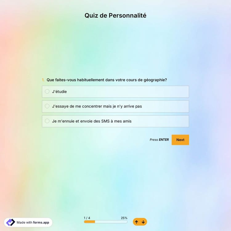 Souhaitez-vous donner aux gens une chance de mieux se connaître? Avec ce modèle de quiz de personnalité gratuit, vous pouvez facilement créer vos propres quiz en ligne à partager avec vos visiteurs et lecteurs. Utilisez forms.app maintenant, un créateur de quiz facile à utiliser avec d'innombrables fonctionnalités et options pratiques!