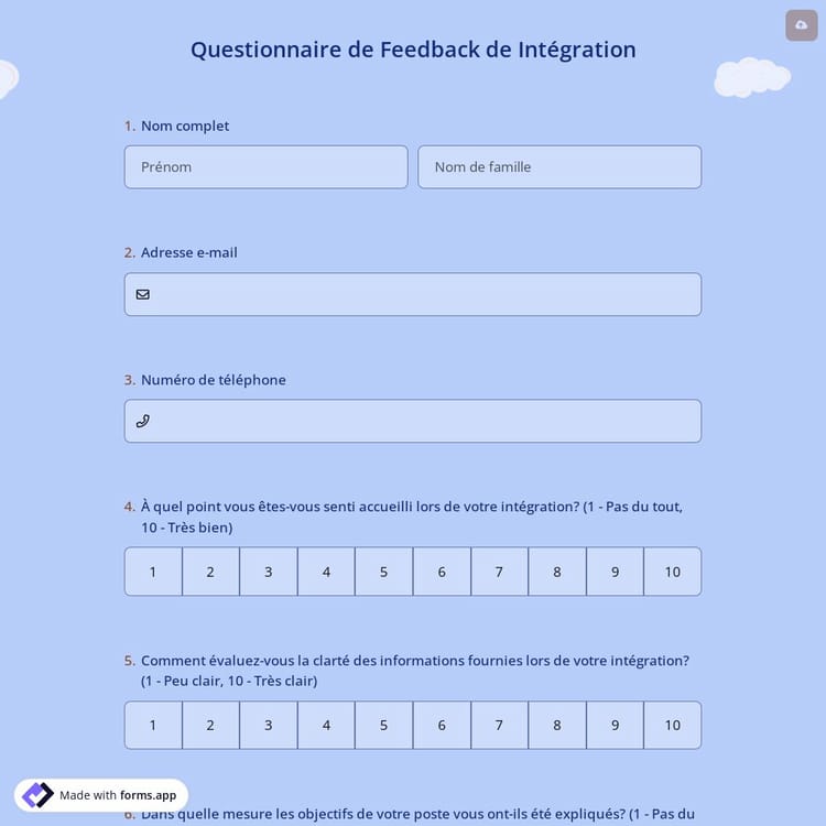 L'intégration dans les entreprises est un processus long qui consomme du temps et des efforts de la part des employeurs et des employés. Et plus il est fluide, meilleur est le flux de travail de l'entreprise. Commencez à découvrir les opinions de vos nouveaux employés avec le modèle gratuit fourni par forms.app.