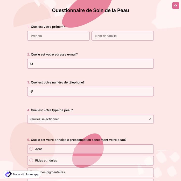 Un questionnaire de soins de la peau est un instrument pour apprendre les besoins et préférences en matière de soins de la peau d'une personne. Les dermatologues, les esthéticiennes et les entreprises de soins de la peau peuvent l'utiliser pour comprendre les caractéristiques distinctives de la peau d'une personne et repérer d'éventuels problèmes ou domaines à améliorer dans leur routine de soins de la peau. Grâce à forms.app, vous pouvez créer votre questionnaire en un rien de temps.