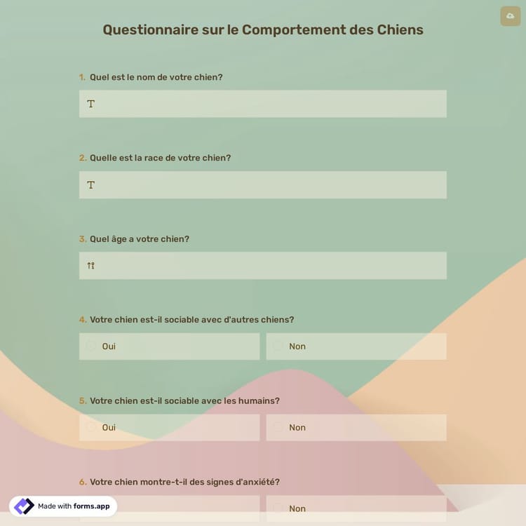 Les questionnaires sur le comportement des chiens vous permettent d'étudier les caractéristiques du chien et de développer un plan de formation approprié. Vous pouvez collecter des informations sur l'historique du chien et ses caractéristiques comportementales avec les résultats du questionnaire. De nombreuses institutions et particuliers peuvent utiliser ces questionnaires en ligne, notamment les comportementalistes animaliers, les vétérinaires et les éducateurs canins. Avec ses modèles gratuits et professionnels, forms.app vous permet d'utiliser des fonctionnalités intelligentes pour créer vos enquêtes. Il vous permet également d'ajouter des options de personnalisation accrocheuses à votre enquête. Vous pouvez également accéder à de nombreux formats de questions via le bouton ajouter un champ. Avec toutes ces fonctionnalités, commencez dès aujourd'hui à créer consciemment votre enquête en quelques minutes !