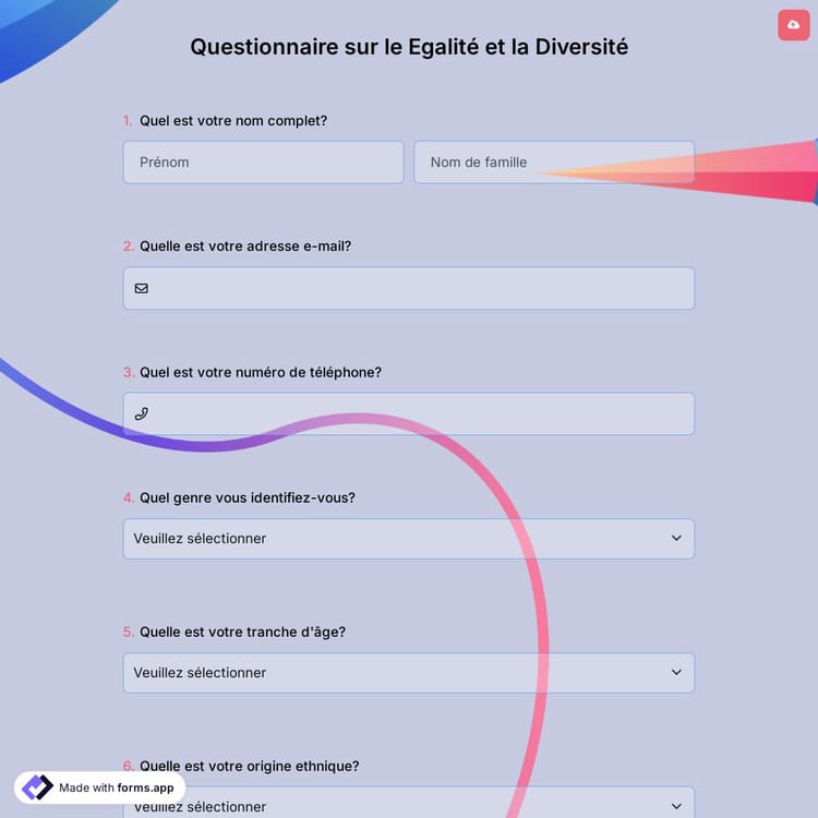 Utilisez le questionnaire sur l'égalité et la diversité pour recueillir des informations auprès de vos employés, candidats à un emploi ou autres sur leurs attitudes et expériences en matière d'égalité et de diversité. Vous pouvez élaborer des politiques et des pratiques à partir de l'enquête qui favorisent l'égalité et la diversité et identifier les défis potentiels. Utilisez le modèle gratuit de questionnaire sur l'égalité et la diversité pour créer facilement votre questionnaire !