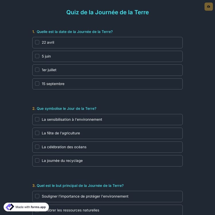 Créez un test en ligne pour rappeler la Journée de la Terre, dans le but de réduire les déchets, de promouvoir la conservation de l'énergie et d'encourager des pratiques durables. Utilisez le modèle de quiz gratuit de forms.app et créez votre propre test. Créez votre quiz dès aujourd'hui pour sensibiliser à la responsabilité environnementale !
