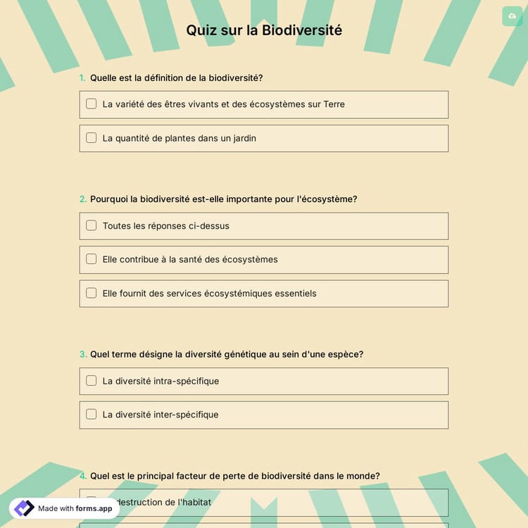 Un modèle de quiz sur la biodiversité est un quiz qui vous permet de tester les connaissances de vos élèves sur la biodiversité. Il existe de nombreux types d'animaux, de plantes et d'autres organismes dans le monde. Nous vivons sur cette terre depuis près de 4 milliards d'années et nous ne connaissons toujours pas le nombre d'espèces qui existent. Laissez forms.app vous aider à créer votre quiz en ligne.