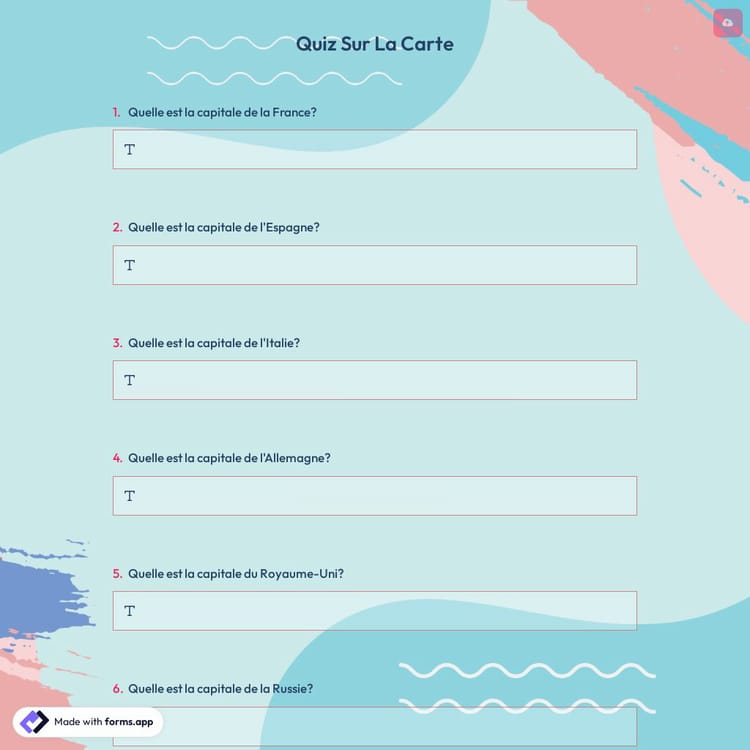 Dans un monde où la technologie a pris le dessus, il n'est pas surprenant que de plus en plus de personnes se tournent vers les quiz en ligne pour tester leurs connaissances. Et ce n’est pas sans raison. Avec les créateurs de quiz, comme forms.app, vous pouvez facilement créer des quiz personnalisés pour votre public en quelques minutes. Cliquez sur « Utiliser le modèle » et essayez vous-même ce modèle de quiz de carte gratuit!