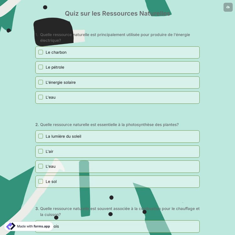 Un quiz peut être utilisé pour une variété de sujets et de matières. Cela contient le modèle pour le quiz sur les ressources naturelles. Il peut être utilisé dans les salles de sciences pour évaluer la compréhension des élèves sur différents thèmes liés aux ressources naturelles. Avec forms.app, vous pouvez créer le meilleur modèle de quiz sur les ressources naturelles en un rien de temps !
