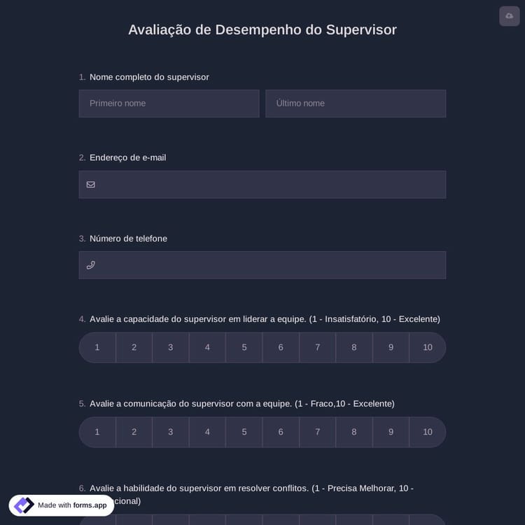 Avaliar as habilidades, capacidades e desempenho geral de um supervisor ou gerente ajuda as organizações a identificar áreas de melhoria. Use o modelo de formulário de avaliação de desempenho do supervisor do forms.app para criar seu próprio formulário e realizar uma avaliação.