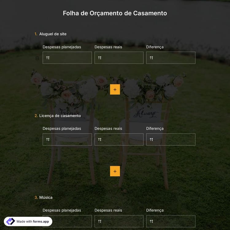 Talvez a primeira coisa a fazer antes de iniciar os preparativos para o casamento seja definir um orçamento. Assim, pode-se decidir antecipadamente quanto gastar com o quê. Existe uma maneira bem simples de fazer isso. Use o formulário de orçamento de casamento! Você pode criar uma planilha de orçamento de casamento gratuita no forms.app e começar imediatamente. E você não precisa de nenhum conhecimento de codificação para fazer isso!