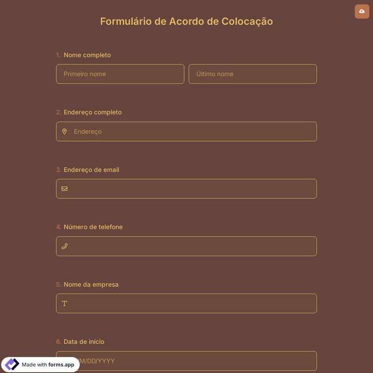 Você pode criar um formulário de acordo de colocação se quiser contratar um estudante que ainda não tenha concluído seus estudos. Você pode criar seu formulário gratuitamente e sem nenhum conhecimento em programação. Comece agora mesmo a criar seu formulário usando o modelo de formulário de acordo de colocação disponível no forms.app!