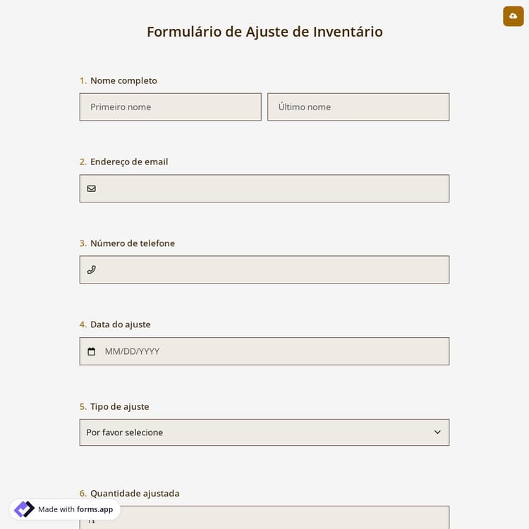 O formulário de ajuste de estoque se refere às entradas feitas periodicamente na contabilidade para corrigir as diferenças entre as mercadorias em estoque que são declaradas e as que estão realmente em estoque. O formulário de ajuste de estoque inclui informações sobre as alterações que você faz nas quantidades das coisas que possui, incluindo o valor da alteração e a razão que a justifica. Você pode facilmente personalizar o formulário de ajuste de estoque selecionando o modelo pronto para uso no forms.app.