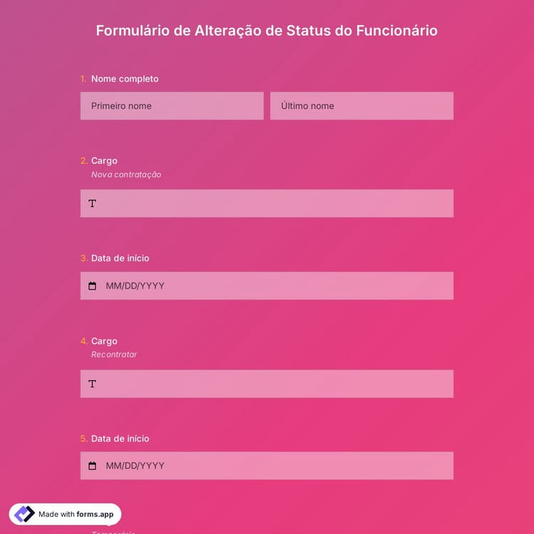 Estar ciente das mudanças sofridas pelos funcionários na organização facilita simultaneamente o acompanhamento do trabalho. Com o modelo de formulário de alteração de status de funcionário online do forms.app, você pode coletar facilmente informações antigas de funcionários e registrar profissionalmente as novas. Você não precisa de nenhum conhecimento de codificação para usar este formulário, o que facilitará o fluxo de trabalho interno. Além disso, todos os recursos são totalmente GRATUITOS para usar!