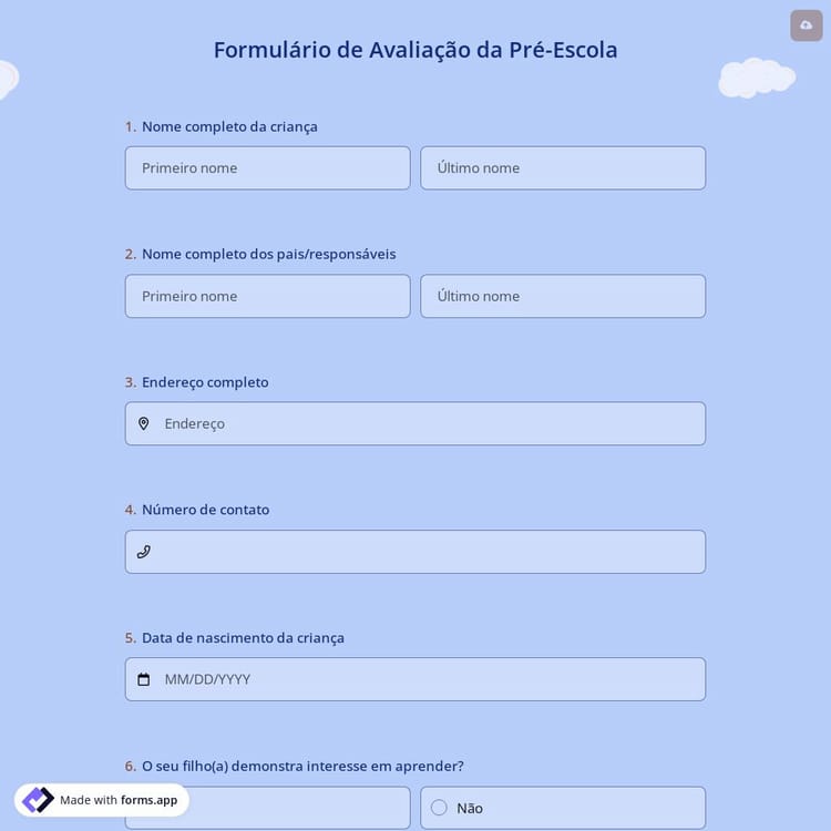 Você gostaria de saber mais sobre crianças na pré-escola online? Com o modelo de formulário de avaliação da pré-escola, você aprende rapidamente do que as crianças precisam. Se você deseja criar formulários sem precisar de conhecimentos em codificação, use o forms.app em pouco tempo!