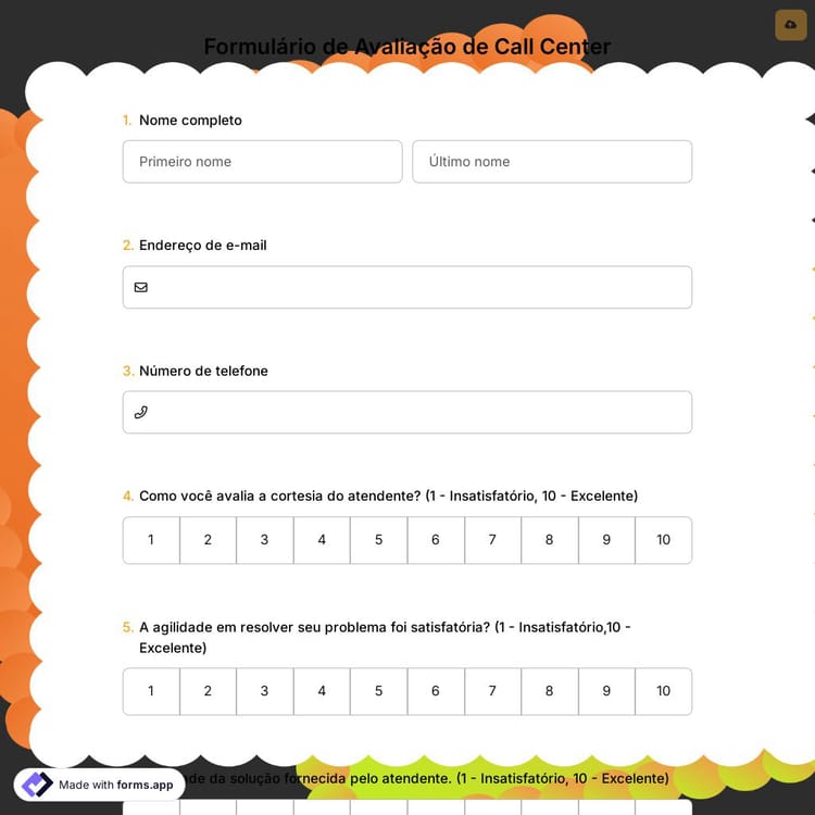 O formulário de avaliação do centro de chamadas é uma ferramenta de avaliação usada para pontuar o serviço fornecido pelo agente de chamadas. Os dados que você coleta deste formulário permitem que você e sua organização lidem com suas deficiências. O modelo de formulário de avaliação do centro de chamadas da forms.app fornece todos os campos necessários. Você pode personalizar o modelo de acordo com seus desejos e necessidades. Use forms.app para acessar gratuitamente todos os formulários de avaliação.