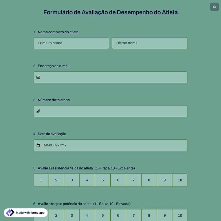 Você está procurando um formulário de avaliação para o desempenho de seus atletas? Você pode acompanhar seu treinamento atlético e programa esportivo. É fácil criar, editar e projetar seu formulário usando o forms.app. Comece a usar este modelo de formulário gratuito para avaliação de desempenho de atletas para criar seu próprio formulário!