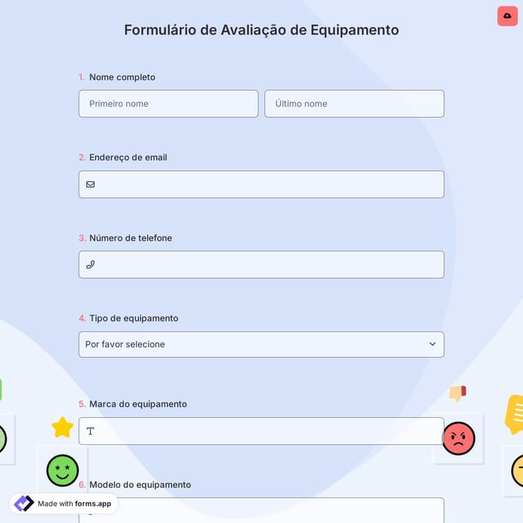 As organizações geralmente utilizam um formulário de avaliação de equipamento para avaliar o desempenho do equipamento e coletar informações sobre o equipamento. As informações coletadas sobre o equipamento através deste formulário de avaliação ajudam as organizações a tomarem melhores decisões ao comprar novos equipamentos. Você pode criar seu formulário de avaliação de equipamento no forms.app em poucos cliques.