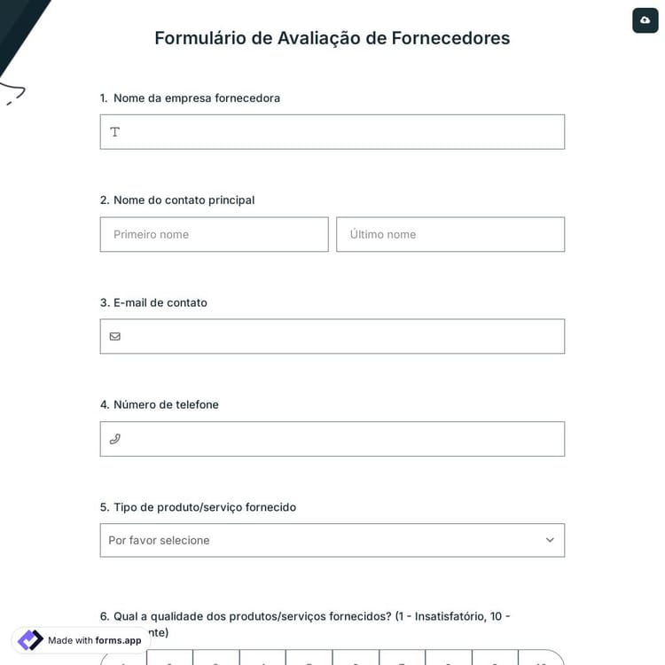 De uma forma profissional, as empresas que trabalham atualmente com fornecedores ou estão considerando fazê-lo podem usar formulários de avaliação de fornecedores para medir o desempenho geral dos fornecedores. Em vez de usar uma simples planilha, você pode começar com o modelo de formulário de avaliação de fornecedores do forms.app como este e aproveitar suas funcionalidades práticas para suas necessidades. Se você está procurando como criar um, basta seguir os passos abaixo: