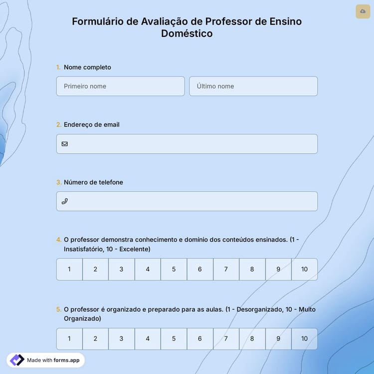 Se você está procurando um exemplo de formulário de avaliação de professor de educação domiciliar, nós temos o que você precisa. Nosso templo gratuito é fácil de usar e pode ajudá-lo a reunir todas as informações necessárias para tomar uma decisão informada sobre seus professores de educação domiciliar. Tudo que você precisa fazer é importar este exemplo e editar seu conteúdo de acordo com suas necessidades. Depois, você pode compartilhá-lo facilmente por meio de seu URL em qualquer plataforma que desejar.