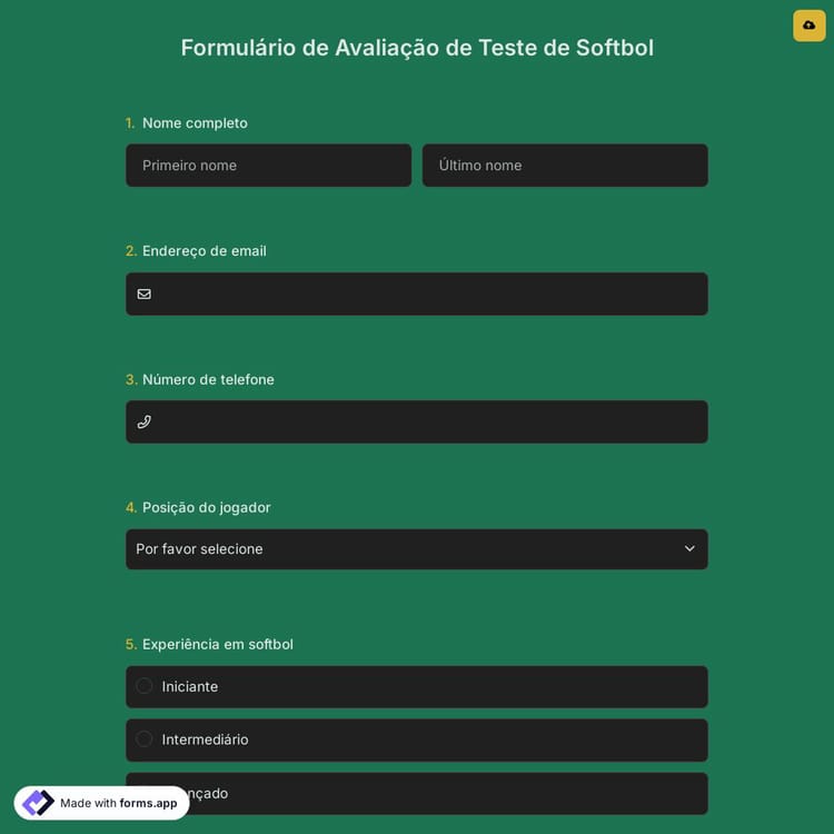 Durante um teste de softball, os jogadores geralmente são convidados a realizar uma variedade de habilidades e exercícios, como defesa, rebatida, arremesso e corrida das bases. Use o modelo de formulário gratuito do forms.app para criar um formulário e registrar suas observações e impressões sobre o desempenho de cada jogador!