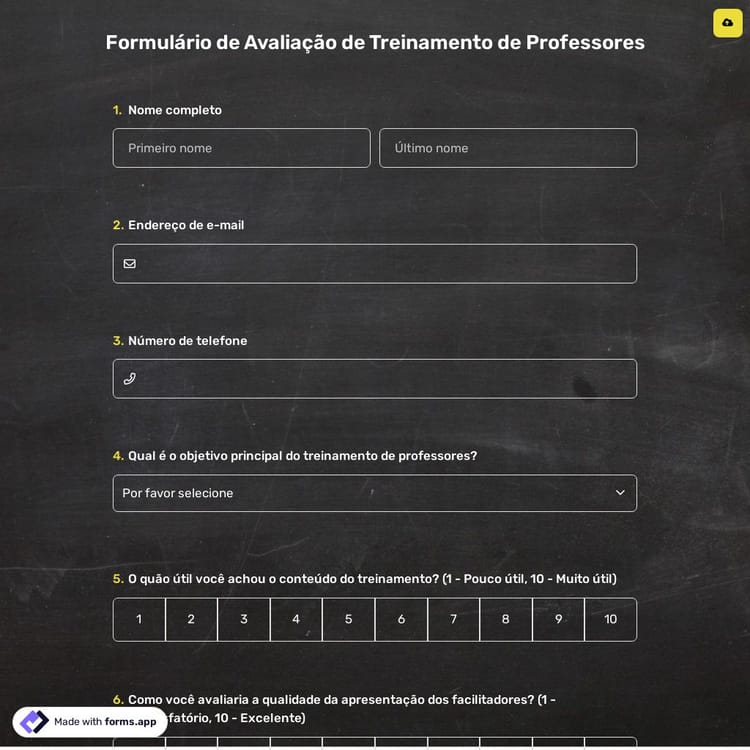Um formulário de avaliação de formação de professores tem como objetivo avaliar a qualidade de um programa de formação para professores. O objetivo deste formulário é coletar os comentários dos professores sobre o conteúdo, a apresentação e os formadores do programa. Uma vez que os dados são coletados, os formadores podem revisar as respostas e melhorar ou eliminar as lacunas com base nos comentários.