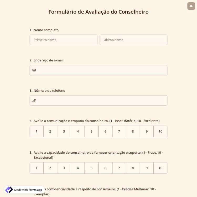Utilize formulários de avaliação do conselheiro para coletar feedback dos clientes sobre o serviço que você oferece. Independentemente do campo que você atenda, você pode personalizar os modelos gratuitos do forms.app de acordo com o seu objetivo.
