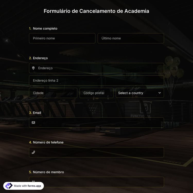 Você está procurando uma maneira mais rápida e eficiente de gerenciar seu clube de fitness? Então, o uso de formulários on-line, como um formulário de cancelamento de associação de academia, o ajudará incrivelmente. Com um formulário online, seus membros podem enviar uma solicitação de cancelamento em segundos. Além disso, este modelo de formulário de cancelamento de associação de academia gratuito reduzirá incrivelmente o processo de criação!