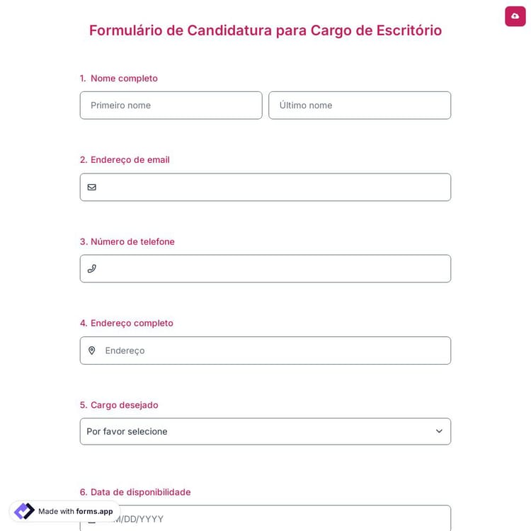 Encontrar o candidato ideal para uma oportunidade de emprego em sua organização é muito mais simples com o formulário de candidatura para emprego em escritório do forms.app. Escolha entre nossos modelos bem projetados para coletar candidaturas de candidatos em busca de empregos de escritório. Assim, você pode facilmente receber e gerenciar as candidaturas criando um formulário de candidatura. Esses formulários são gratuitos para todos.