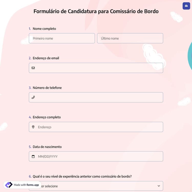 A criação de formulários online se tornou muito mais profissional com a forms.app. Ele facilita sua vida oferecendo modelos prontos com designs gratuitos e personalizáveis. Vamos ver agora como criar um formulário de candidatura para emprego de agente de bordo.