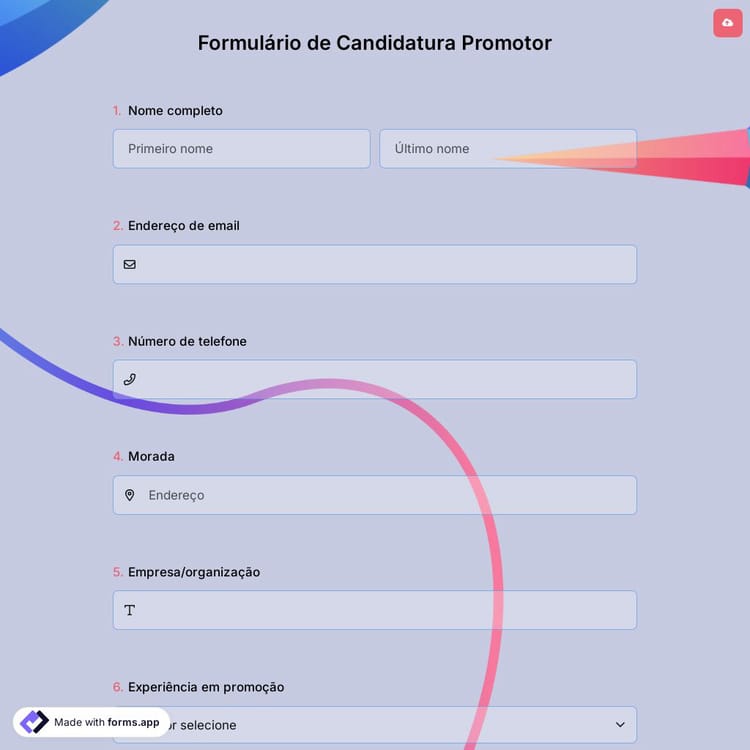 Processar pedidos pode ser tedioso. Para isso, usar um formulário de candidatura de promotor que você criará com um construtor de formulários gratuito como forms.app pode ser a sua solução. É hora de usar o modelo de formulário de candidatura de promotor para começar agora mesmo!