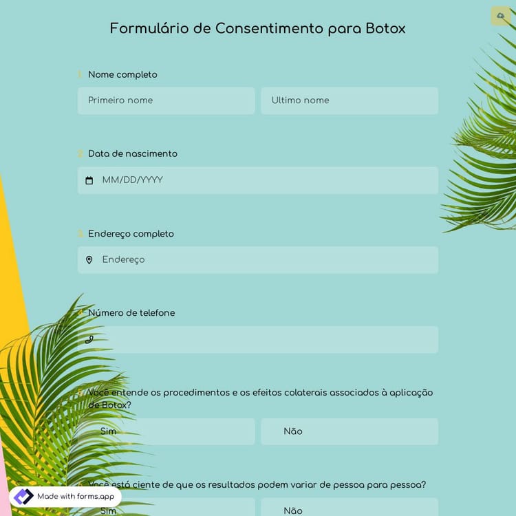 De acordo com as suas preferências, poderá incluir diferentes campos para recolha de informação no seu formulário de consentimento. Para agilizar esse processo, o forms.app oferece um modelo de formulário de consentimento de botox que possui alguns campos necessários e um design profissional. Ao criar seu formulário de consentimento para Botox, você pode considerar adicionar campos para fornecer ou obter as seguintes informações:
