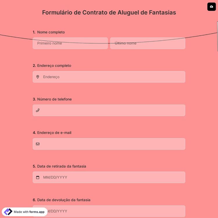 Modelos de formulários de contrato possuem uma seção de contrato que mostra os termos e condições de qualquer contrato. Este formulário de aluguel de fantasias solicita os dados pessoais do seu cliente, como nome, e-mail, número de telefone e endereço. Você pode usar este formulário de contrato de aluguel de fantasias gratuito para facilitar a abordagem de seus clientes para alugar uma fantasia. Clique no botão "Usar modelo" e comece a criar seu formulário personalizado agora mesmo!