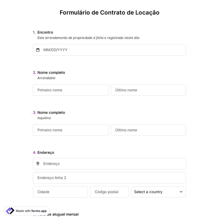 Tudo o que foi mencionado e muito mais ajuda a delinear os termos do contrato e abrange muitos assuntos para que tanto o inquilino quanto o proprietário estejam todos em paz. Existem diferentes tipos de contratos de aluguel e arrendamento e seus termos variam. Pode ser uma locação comercial, uma locação residencial, um contrato de aluguel e muito mais. O modelo de formulário de contrato de locação do forms.app tem algumas das coisas necessárias já definidas e prontas para uso. Você sempre pode adicionar outros termos às suas necessidades e personalizar termos pré-existentes.