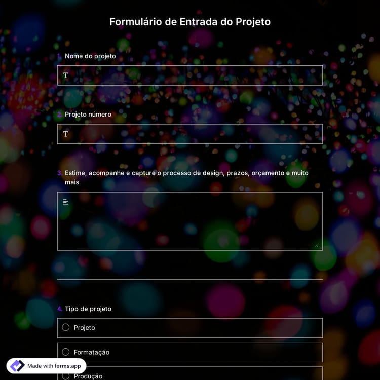 O formulário de entrada do projeto é o documento que os clientes enviam às equipes relevantes para os projetos que desejam realizar. Além das solicitações de projetos como o tipo de projeto a ser realizado, a data de início e término, o orçamento alocado, informações de contato como número de telefone, nome, sobrenome também estão incluídos no formulário. Ao usar o formulário de entrada de projetos on-line do forms.app, você economizará dezenas de papéis e economizará tempo. Você também pode começar imediatamente, pois pode acessar facilmente todas as informações de que precisa.