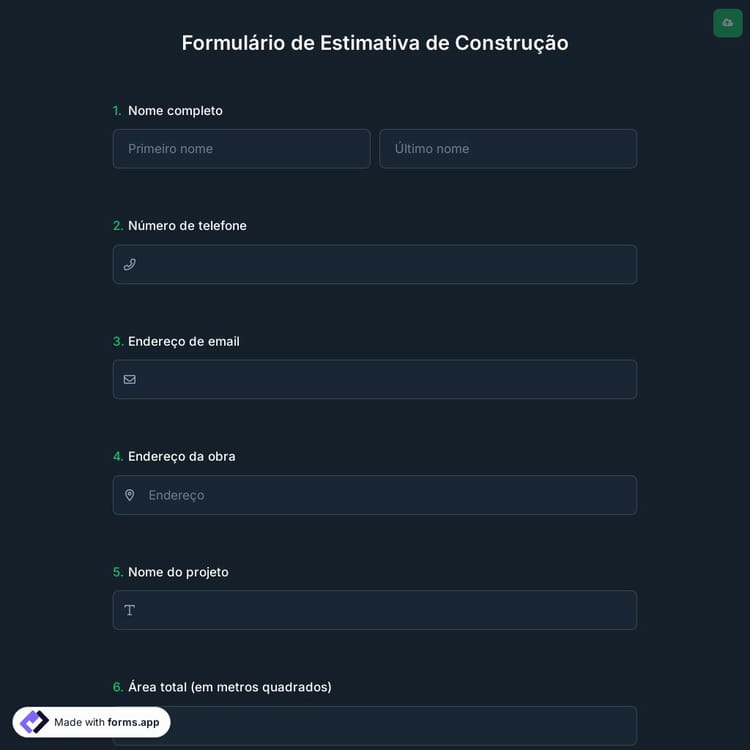 O formulário de estimativa de construção é uma etapa crucial no processo de construção. Ele ajuda os clientes a estimar todos os custos envolvidos, desde materiais até mão de obra e tudo mais. forms.app oferece um modelo de formulário de estimativa de construção gratuito.
