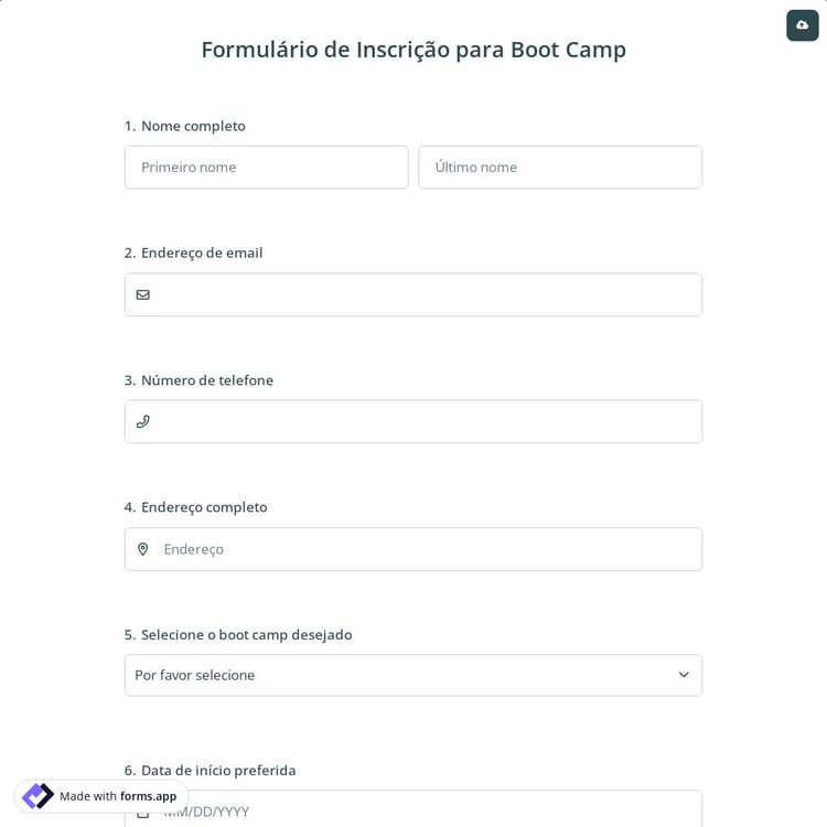 Bootcamps são geralmente programas de curta duração focados em aprendizado prático. Crie seu formulário com o modelo de inscrição em um bootcamp gratuito para confirmar a inscrição e fornecer mais informações sobre o programa aos participantes!