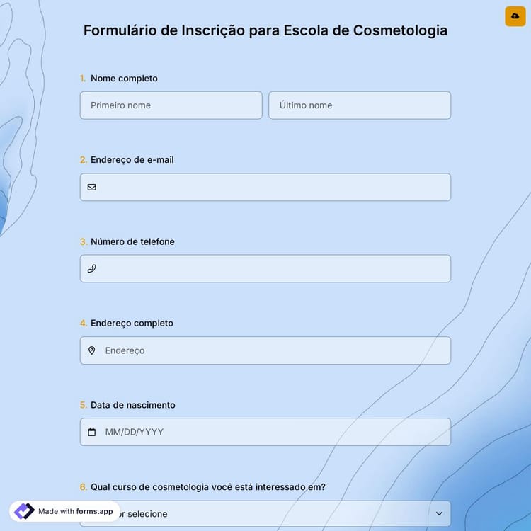 Este formulário de pedido é para você se você está interessado em beleza e está considerando trabalhar nesta área. Experimente o modelo de formulário de pedido de inscrição na escola de cosmetologia grátis do forms.app para coletar pedidos facilmente!